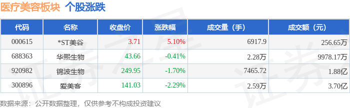 证券之星消息,12月29日医疗美容板块较上一交易日下跌0.97%,爱美客领跌。当日上证指数报收于3965.28,上涨0.04%。深证成指报收于13537.1,下跌0.49%。医疗美容板块个股涨跌见下表: