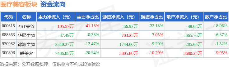 从资金流向上来看,当日医疗美容板块主力资金净流出7417.96万元,游资资金净流入4452.13万元,散户资金净流入2965.84万元。医疗美容板块个股资金流向见下表: