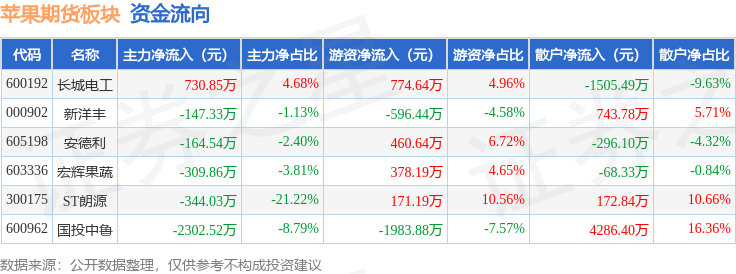 从资金流向上来看,当日苹果期货板块主力资金净流出2537.43万元,游资资金净流出795.67万元,散户资金净流入3333.1万元。苹果期货板块个股资金流向见下表: