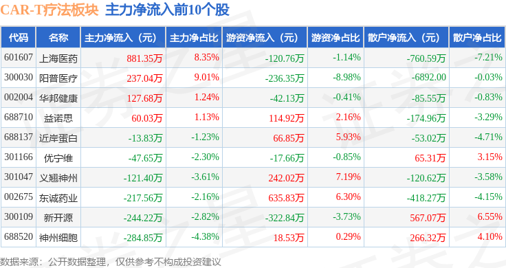 从资金流向上来看,当日CAR-T疗法板块主力资金净流出7.33亿元,游资资金净流入1.75亿元,散户资金净流入5.58亿元。CAR-T疗法板块个股资金流向见下表: