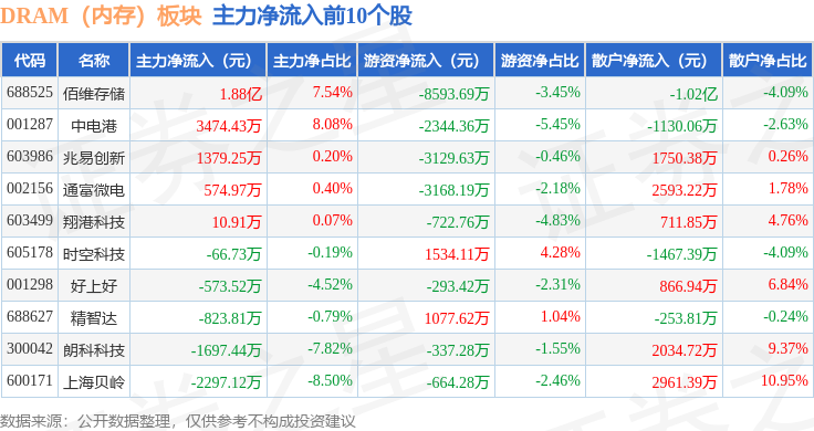 从资金流向上来看,当日DRAM(内存)板块主力资金净流出22.6亿元,游资资金净流入3.28亿元,散户资金净流入19.32亿元。DRAM(内存)板块个股资金流向见下表: