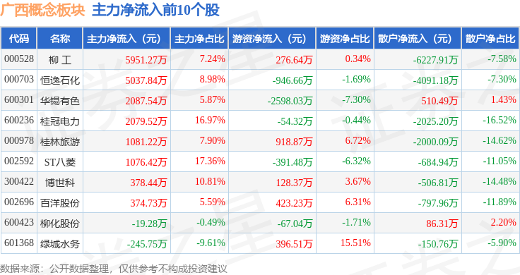 从资金流向上来看,当日广西概念板块主力资金净流出3.81亿元,游资资金净流入6853.38万元,散户资金净流入3.12亿元。广西概念板块个股资金流向见下表: