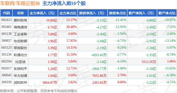 从资金流向上来看,当日车联网/车路云板块主力资金净流出15.37亿元,游资资金净流出7.3亿元,散户资金净流入22.66亿元。车联网/车路云板块个股资金流向见下表: