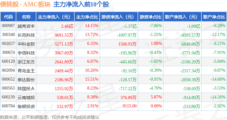 从资金流向上来看,当日债转股 · AMC板块主力资金净流入1.58亿元,游资资金净流出1.22亿元,散户资金净流出3557.86万元。债转股 · AMC板块个股资金流向见下表: