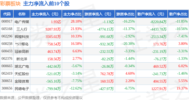 从资金流向上来看,当日彩票板块主力资金净流入7212.89万元,游资资金净流出1.26亿元,散户资金净流入5365.37万元。彩票板块个股资金流向见下表: