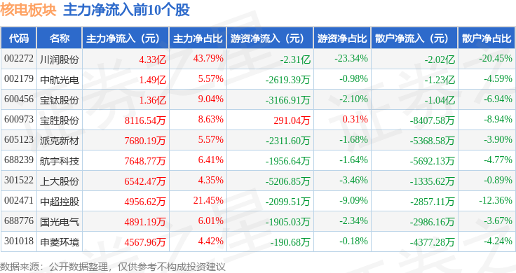 从资金流向上来看,当日核电板块主力资金净流出61.78亿元,游资资金净流入9.75亿元,散户资金净流入52.03亿元。核电板块个股资金流向见下表: