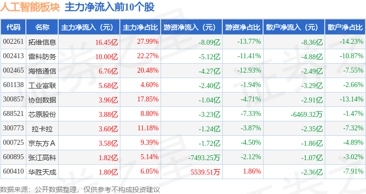 从资金流向上来看,当日人工智能板块主力资金净流出59.85亿元,游资资金净流出7917.44万元,散户资金净流入60.64亿元。人工智能板块个股资金流向见下表: