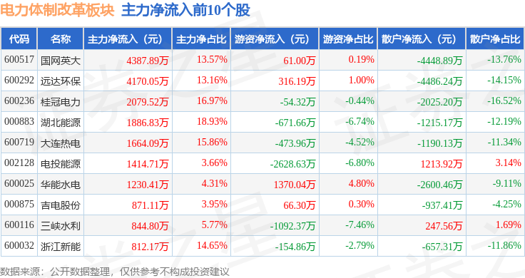 从资金流向上来看,当日电力体制改革板块主力资金净流出15.85亿元,游资资金净流入9.45亿元,散户资金净流入6.39亿元。电力体制改革板块个股资金流向见下表: