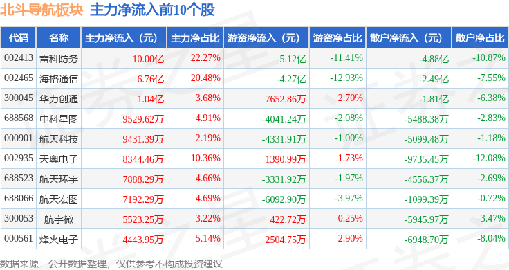 从资金流向上来看,当日北斗导航板块主力资金净流出32.75亿元,游资资金净流入2.99亿元,散户资金净流入29.76亿元。北斗导航板块个股资金流向见下表: