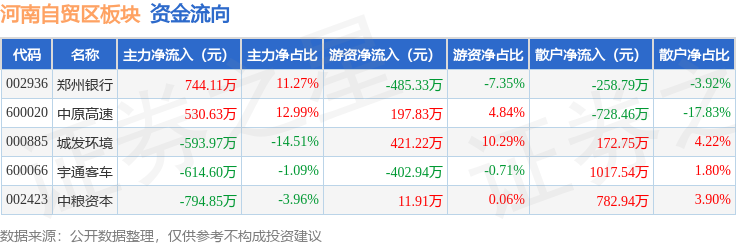从资金流向上来看,当日河南自贸区板块主力资金净流出728.68万元,游资资金净流出257.3万元,散户资金净流入985.98万元。河南自贸区板块个股资金流向见下表: