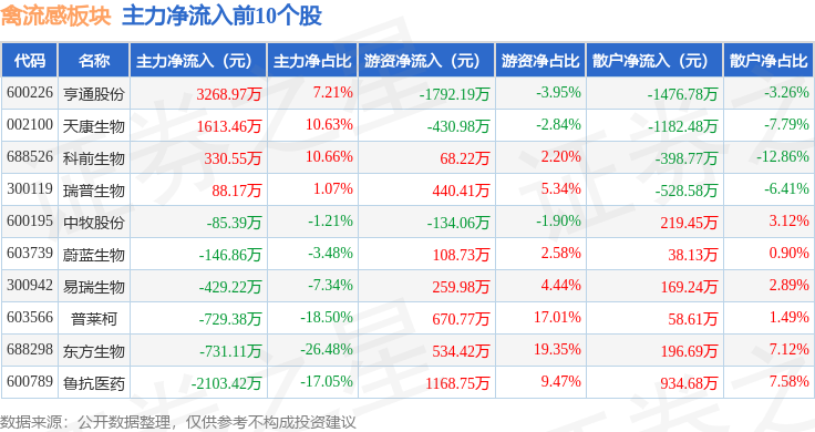 从资金流向上来看,当日禽流感板块主力资金净流出8309.12万元,游资资金净流入5324.41万元,散户资金净流入2984.7万元。禽流感板块个股资金流向见下表: