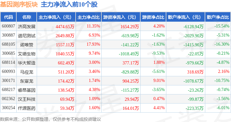 从资金流向上来看,当日基因测序板块主力资金净流出5.49亿元,游资资金净流入1.93亿元,散户资金净流入3.57亿元。基因测序板块个股资金流向见下表: