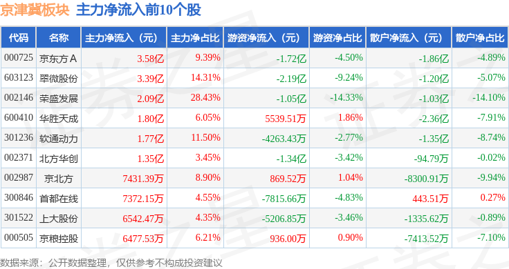 从资金流向上来看,当日京津冀板块主力资金净流出4.32亿元,游资资金净流入2003.78万元,散户资金净流入4.12亿元。京津冀板块个股资金流向见下表: