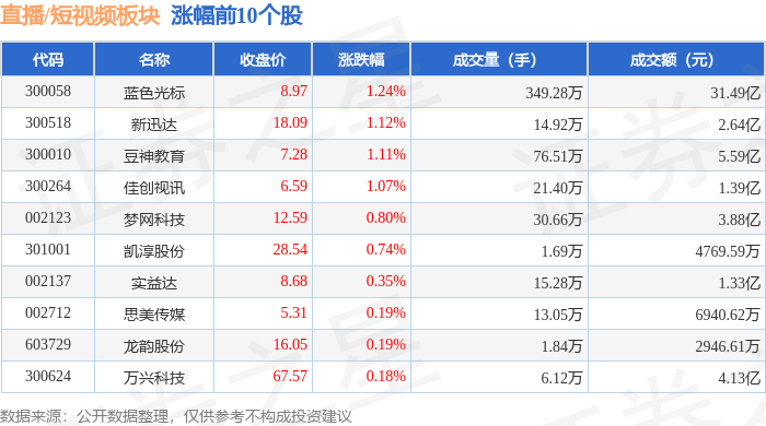 证券之星消息,12月29日直播/短视频板块较上一交易日下跌0.73%,合百集团领跌。当日上证指数报收于3965.28,上涨0.04%。深证成指报收于13537.1,下跌0.49%。直播/短视频板块个股涨跌见下表: