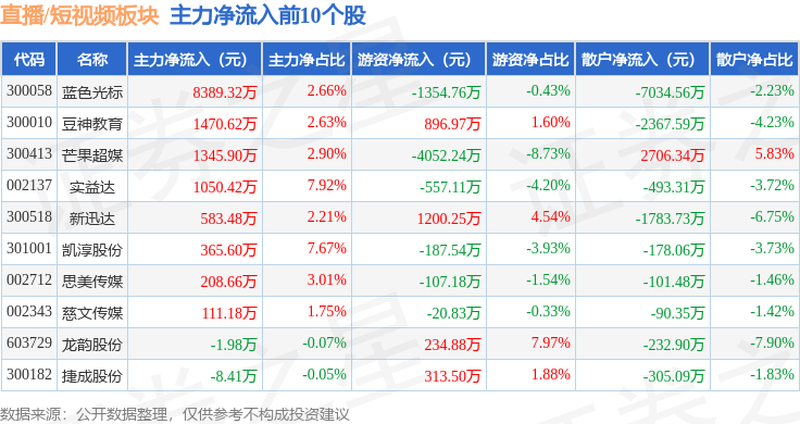 从资金流向上来看,当日直播/短视频板块主力资金净流出5.61亿元,游资资金净流入8155.32万元,散户资金净流入4.79亿元。直播/短视频板块个股资金流向见下表: