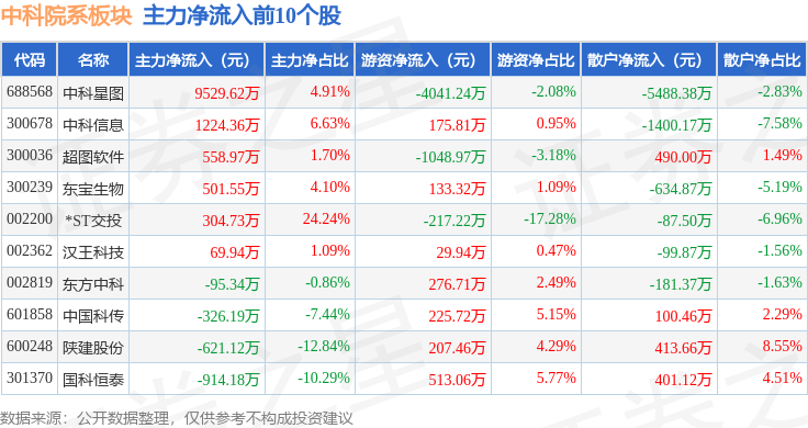 从资金流向上来看,当日中科院系板块主力资金净流出10.83亿元,游资资金净流入2.64亿元,散户资金净流入8.19亿元。中科院系板块个股资金流向见下表: