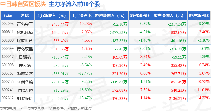 从资金流向上来看,当日中日韩自贸区板块主力资金净流出4.15亿元,游资资金净流入2.37亿元,散户资金净流入1.78亿元。中日韩自贸区板块个股资金流向见下表: