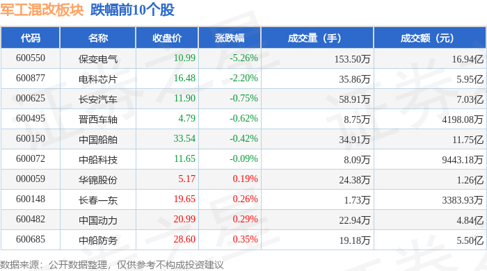 证券之星消息,12月29日军工混改板块较上一交易日下跌0.2%,保变电气领跌。当日上证指数报收于3965.28,上涨0.04%。深证成指报收于13537.1,下跌0.49%。军工混改板块个股涨跌见下表: