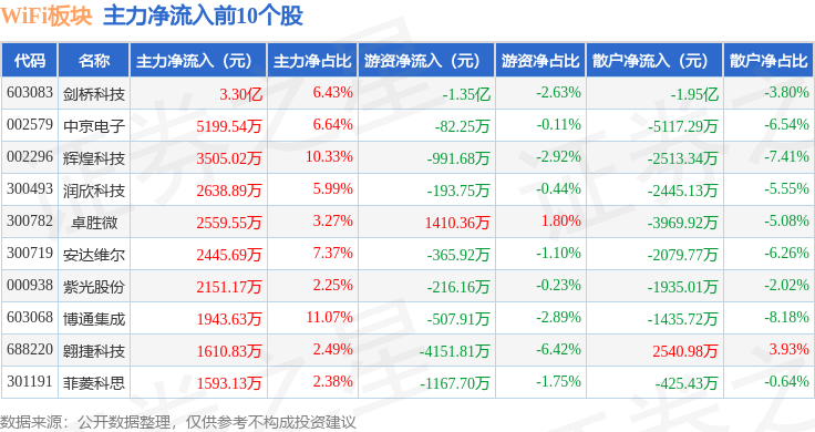 从资金流向上来看,当日WiFi板块主力资金净流出23.97亿元,游资资金净流入3.36亿元,散户资金净流入20.61亿元。WiFi板块个股资金流向见下表: