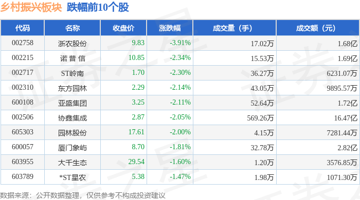 证券之星消息,12月29日乡村振兴板块较上一交易日下跌0.71%,浙农股份领跌。当日上证指数报收于3965.28,上涨0.04%。深证成指报收于13537.1,下跌0.49%。乡村振兴板块个股涨跌见下表: