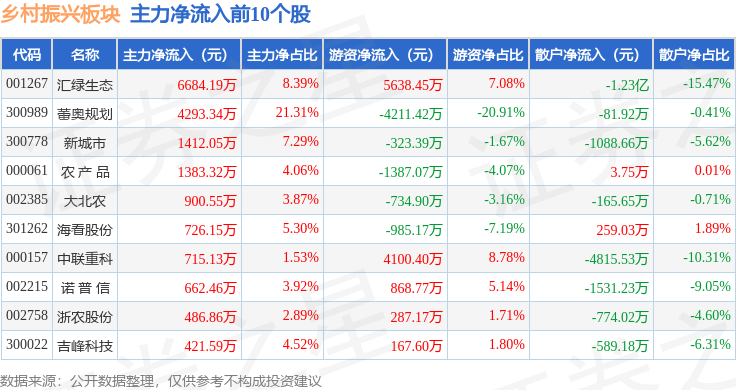 从资金流向上来看,当日乡村振兴板块主力资金净流出3.52亿元,游资资金净流入1.91亿元,散户资金净流入1.61亿元。乡村振兴板块个股资金流向见下表: