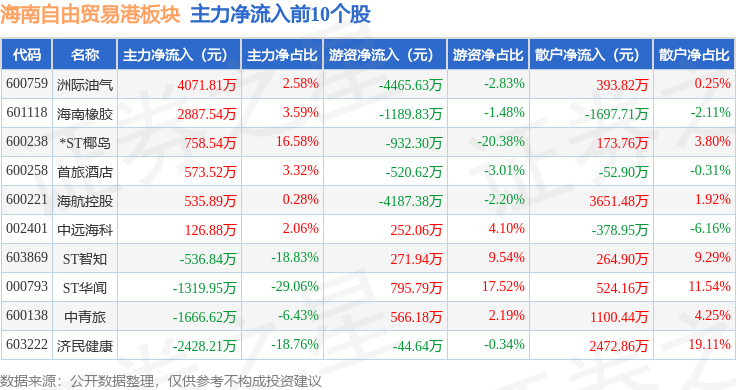 从资金流向上来看,当日海南自由贸易港板块主力资金净流出27.78亿元,游资资金净流入3.36亿元,散户资金净流入24.42亿元。海南自由贸易港板块个股资金流向见下表: