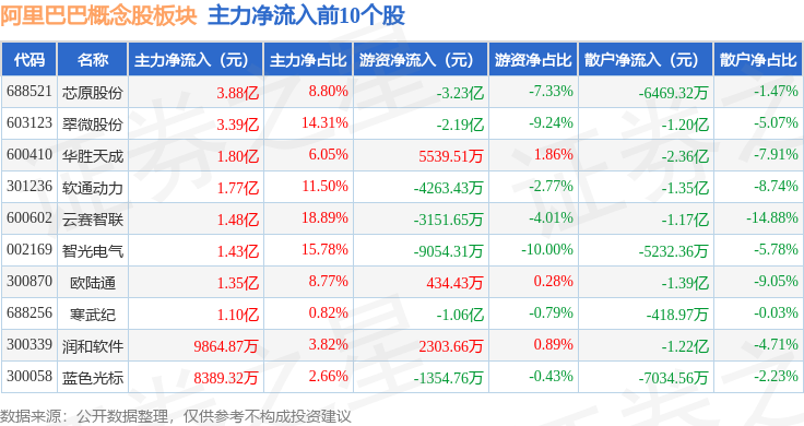 从资金流向上来看,当日阿里巴巴概念股板块主力资金净流出22.47亿元,游资资金净流出3.19亿元,散户资金净流入25.67亿元。阿里巴巴概念股板块个股资金流向见下表: