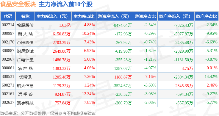 从资金流向上来看,当日食品安全板块主力资金净流入1560.1万元,游资资金净流出5036.42万元,散户资金净流入3476.32万元。食品安全板块个股资金流向见下表: