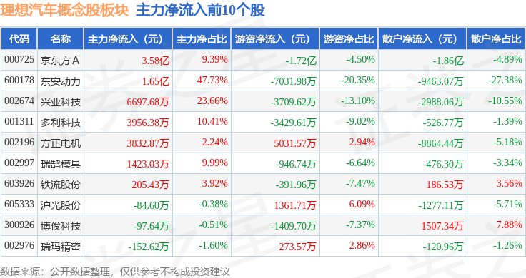 从资金流向上来看,当日理想汽车概念股板块主力资金净流出1.62亿元,游资资金净流出1.06亿元,散户资金净流入2.68亿元。理想汽车概念股板块个股资金流向见下表: