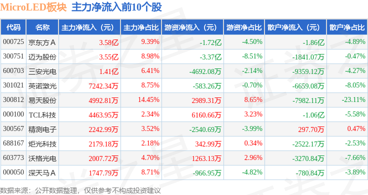 从资金流向上来看,当日MicroLED板块主力资金净流出1.54亿元,游资资金净流出2.32亿元,散户资金净流入3.87亿元。MicroLED板块个股资金流向见下表: