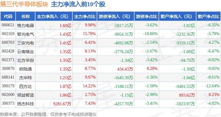 从资金流向上来看,当日第三代半导体板块主力资金净流出53.08亿元,游资资金净流入2.88亿元,散户资金净流入50.2亿元。第三代半导体板块个股资金流向见下表: