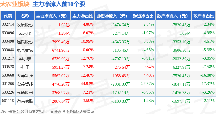 从资金流向上来看,当日大农业板块主力资金净流出19.46亿元,游资资金净流入3.98亿元,散户资金净流入15.48亿元。大农业板块个股资金流向见下表: