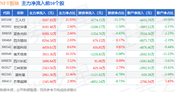 从资金流向上来看,当日NFT板块主力资金净流出9.31亿元,游资资金净流入2.72亿元,散户资金净流入6.59亿元。NFT板块个股资金流向见下表: