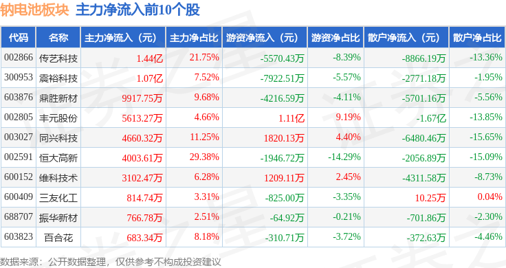 从资金流向上来看,当日钠电池板块主力资金净流出78.63亿元,游资资金净流入19.15亿元,散户资金净流入59.49亿元。钠电池板块个股资金流向见下表: