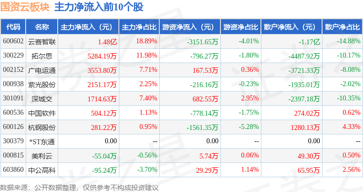 从资金流向上来看,当日国资云板块主力资金净流出18.68亿元,游资资金净流入7.34亿元,散户资金净流入11.34亿元。国资云板块个股资金流向见下表: