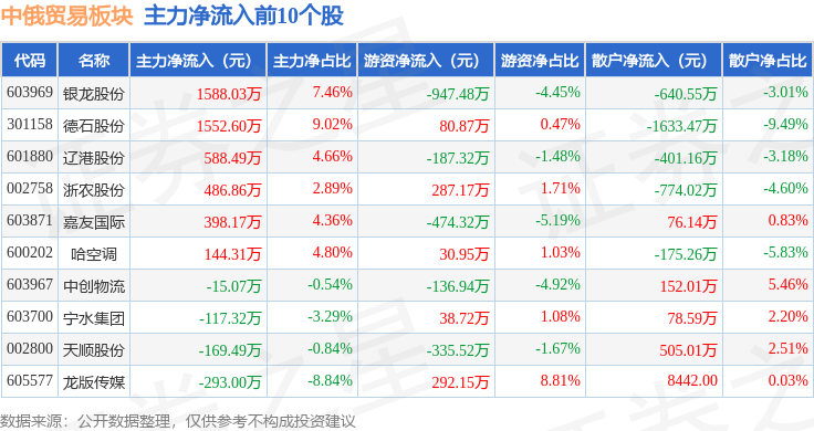 从资金流向上来看,当日中俄贸易板块主力资金净流出1.12亿元,游资资金净流入666.24万元,散户资金净流入1.05亿元。中俄贸易板块个股资金流向见下表: