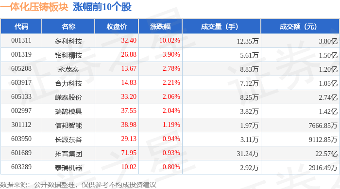 从资金流向上来看,当日一体化压铸板块主力资金净流出4.38亿元,游资资金净流出2360.82万元,散户资金净流入4.61亿元。一体化压铸板块个股资金流向见下表:
