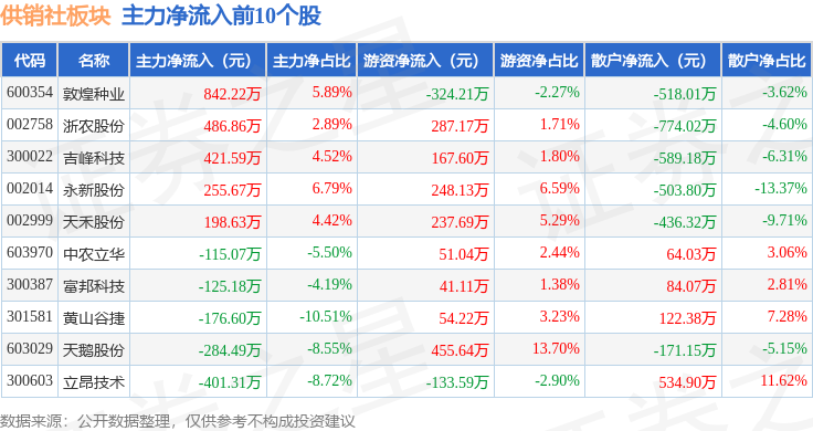 从资金流向上来看,当日供销社板块主力资金净流出2.69亿元,游资资金净流入7598.78万元,散户资金净流入1.93亿元。供销社板块个股资金流向见下表: