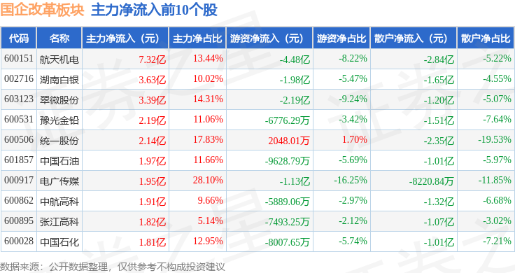从资金流向上来看,当日国企改革板块主力资金净流出152.63亿元,游资资金净流入30.21亿元,散户资金净流入122.42亿元。国企改革板块个股资金流向见下表: