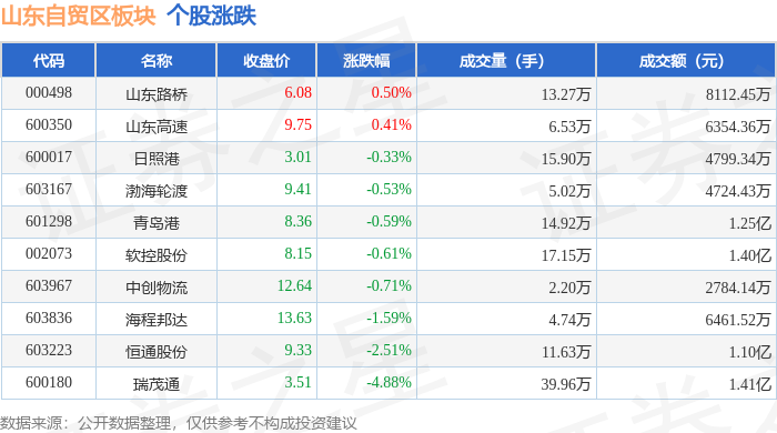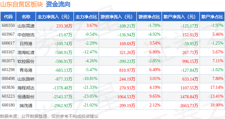 从资金流向上来看,当日山东自贸区板块主力资金净流出9522.48万元,游资资金净流入2536.32万元,散户资金净流入6986.17万元。山东自贸区板块个股资金流向见下表: