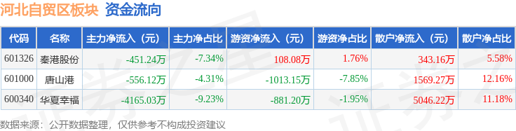 从资金流向上来看,当日河北自贸区板块主力资金净流出5172.39万元,游资资金净流出1786.27万元,散户资金净流入6958.66万元。河北自贸区板块个股资金流向见下表: