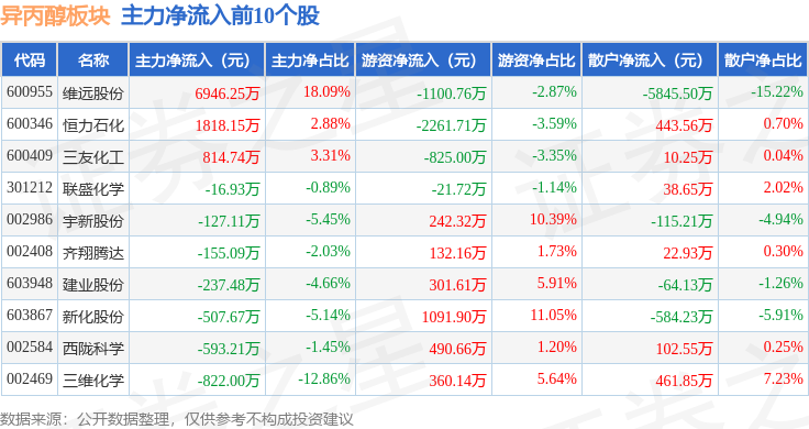 从资金流向上来看,当日异丙醇板块主力资金净流出2.68亿元,游资资金净流入7976.89万元,散户资金净流入1.89亿元。异丙醇板块个股资金流向见下表: