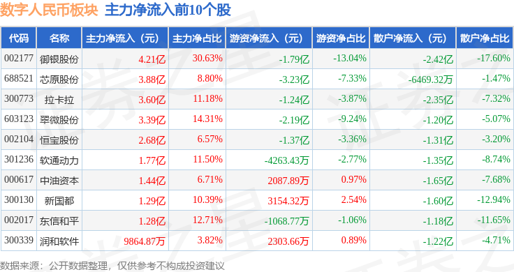 从资金流向上来看,当日数字人民币板块主力资金净流入23.15亿元,游资资金净流出6.54亿元,散户资金净流出16.61亿元。数字人民币板块个股资金流向见下表: