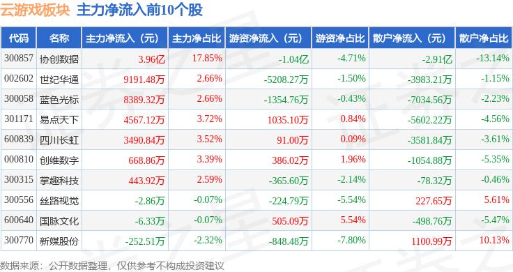 从资金流向上来看,当日云游戏板块主力资金净流出7.36亿元,游资资金净流入1.95亿元,散户资金净流入5.41亿元。云游戏板块个股资金流向见下表: