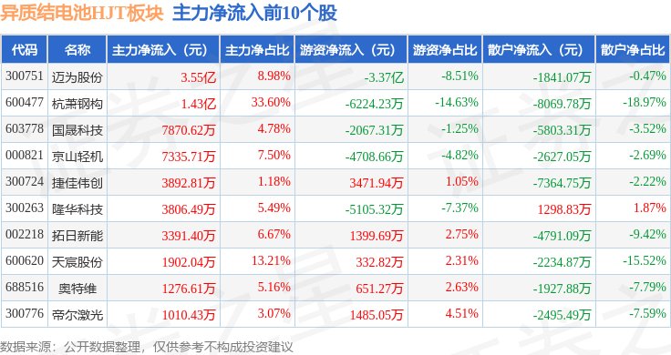 从资金流向上来看,当日异质结电池HJT板块主力资金净流出13.2亿元,游资资金净流出1508.62万元,散户资金净流入13.35亿元。异质结电池HJT板块个股资金流向见下表: