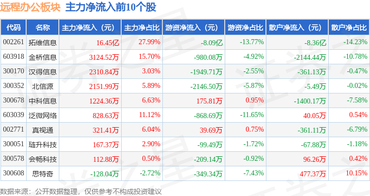 从资金流向上来看,当日远程办公板块主力资金净流入6.14亿元,游资资金净流出7.87亿元,散户资金净流入1.73亿元。远程办公板块个股资金流向见下表: