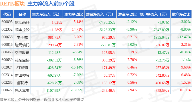 从资金流向上来看,当日REITs板块主力资金净流入6369.81万元,游资资金净流出3298.52万元,散户资金净流出3071.29万元。REITs板块个股资金流向见下表: