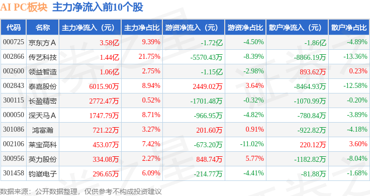 从资金流向上来看,当日AI PC板块主力资金净流出4.61亿元,游资资金净流出3.66亿元,散户资金净流入8.27亿元。AI PC板块个股资金流向见下表: