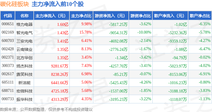 从资金流向上来看,当日碳化硅板块主力资金净流出8.22亿元,游资资金净流出2.95亿元,散户资金净流入11.17亿元。碳化硅板块个股资金流向见下表: