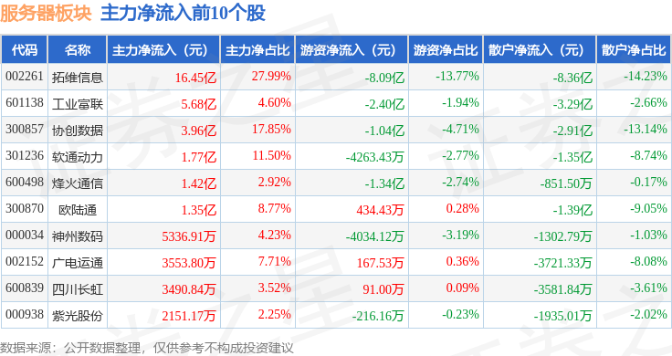 从资金流向上来看,当日服务器板块主力资金净流入6.48亿元,游资资金净流出7.39亿元,散户资金净流入9096.67万元。服务器板块个股资金流向见下表: